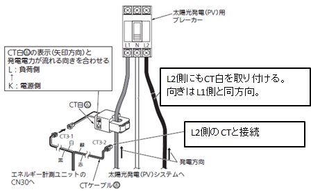 ①太陽光発電(PV)用CTの取付け位置を確認してください。太陽光発電(PV)用CT*-1はL1相(赤い電力線)、CT*-2はL2相(黒い電力線)に取付けます。太陽光発電(PV)回路を、分電盤の2次側分岐回路に直接取付けるタイプのブレーカに接続している場合は、ブレーカの分電盤への取付け位置(上段か下段か)によってL1、L2が入替わる場合があるので特に注意してください。